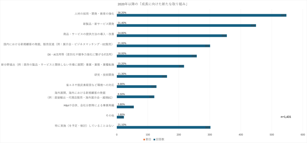 東京商工会議所が2024年に行ったアンケート調査では、約8割の企業が「成長に向けた新たな取り組み」を実施していると回答しています。その内容は「新商品・サービス開発」「業務プロセスの見直し」「デジタル技術の活用」など多岐にわたります。これらの企業の41.4%が販売数量の拡大に成功しており、「販売単価の上昇」も24.8%の企業で達成されました。
