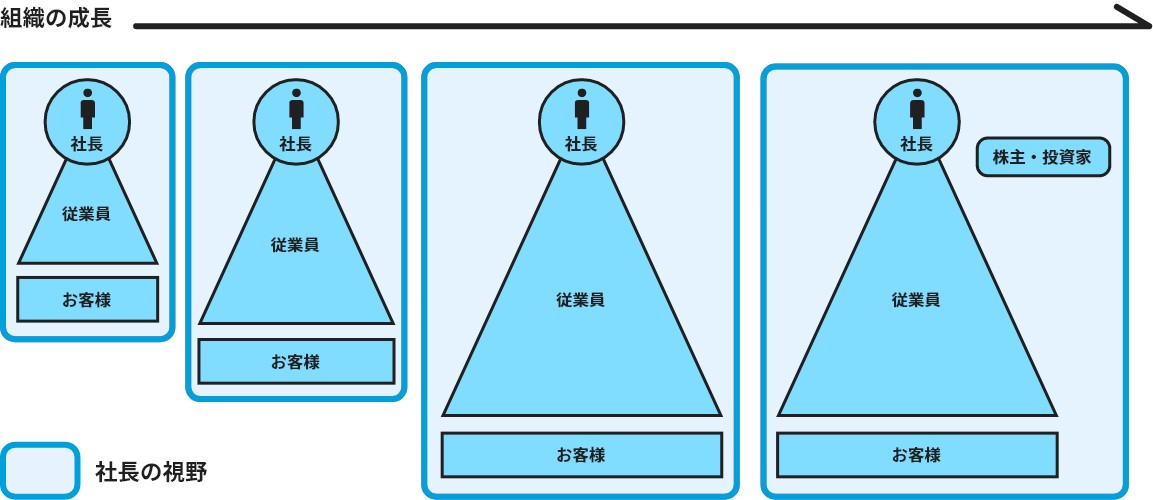 それによって、組織が成長すると、経営者が把握できる視野も変わってきます。この点について、より詳しく見ていきましょう。